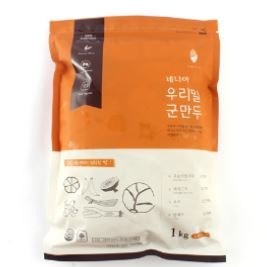 돼지고기(무항생제/국산)27.87%, 밀가루(무농약/국산)26.7%, 부추(국산), 양배추(국산), 당면(국산), 대파(국산), 양파(국산), 난백(국산), 마늘(국산), 혼합간장(국산), 정제소금(국산), 생각(국산), 유기농설탕(수입), 참기름(국산), 후추(수입)