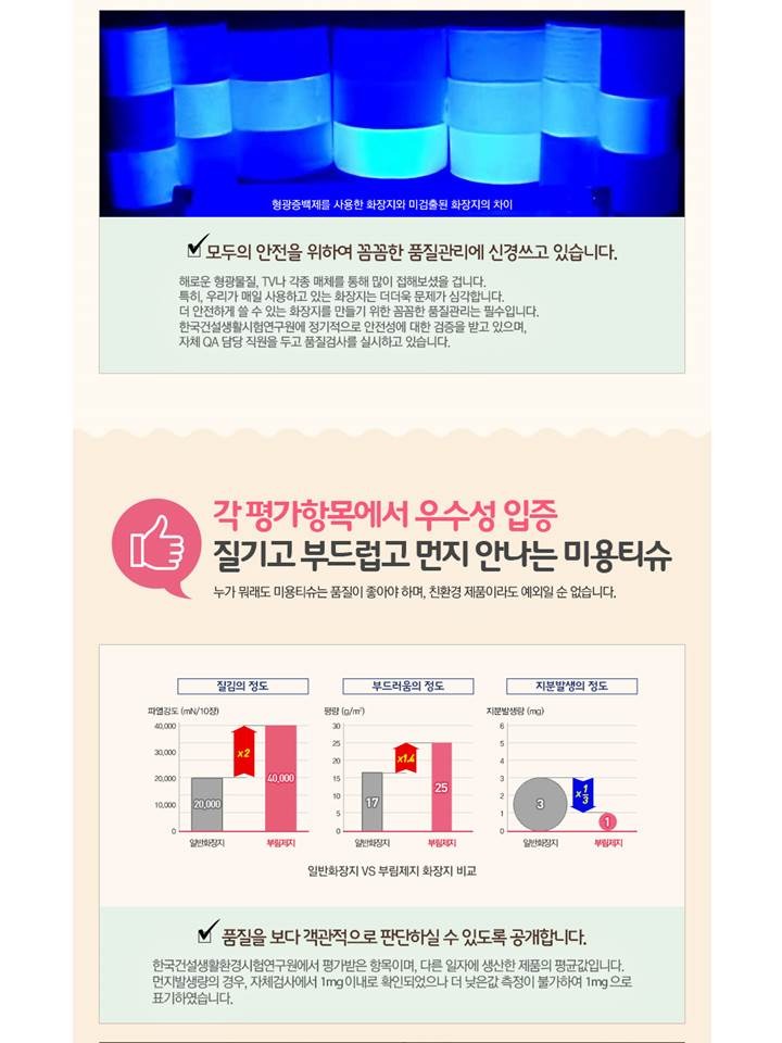 - 형광표백을 하지 않아 약품으로 인한 생태계 파괴를 막을 수 있으며, 우리 몸에도 안전합니다.