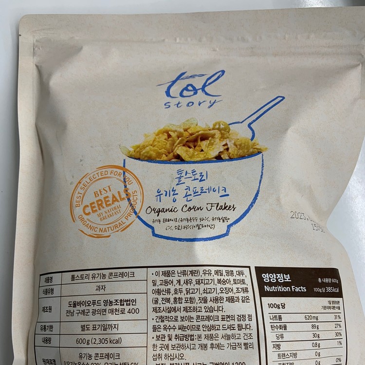 원재료명 : 유기농콘프레이크(유기농옥수수 92%, 유기농설탕 6%, 소금(이탈리아산) 73%, 유기농 설탕 27%
